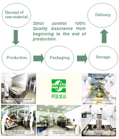 Marford (Qingdao) Food Co., Ltd. adopts a series of international quality management systems such as ISO 9001:2000, Hazard Analysis Critical Control Points System (HACCP) and British Retail Consortium (BRC). Throughout the whole production stage, starting with selecting the finest ingredients through to the production, packaging and preservation stages, quality control is maintained at the highest level before the products are exported overseas. We aspire to continually maintain the quality of our products and put our customers foremost. |  |